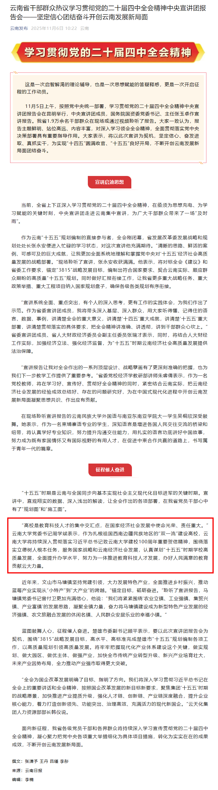 【云南发布】云南省干部群众热议学习贯彻党的二十届四中全会精神中央宣讲团报告会——坚定信心团结奋斗开创云南发展新局面